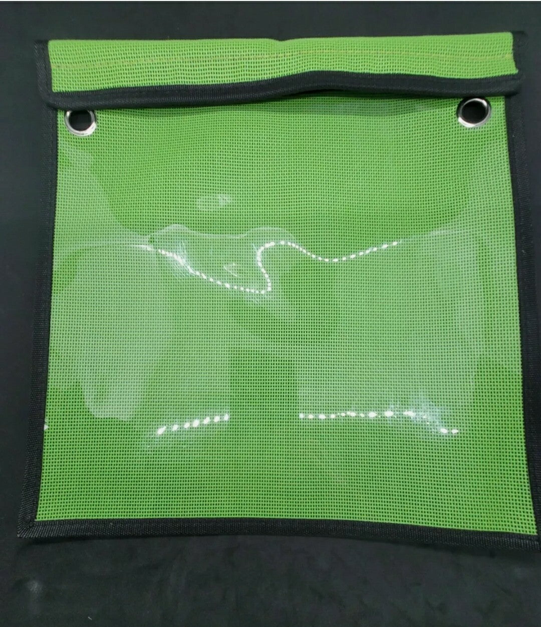 This bag 1 pocket 12"x12". Has Velcro closer and 2 grommets to hang it up. Made of heavy clear vinyl ,pvc coated mesh. Great to keep things dry.