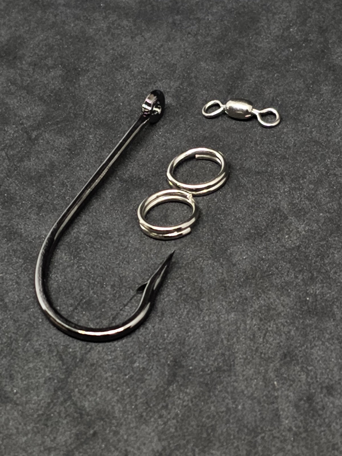 It comes with a 8/0 2x Strong Mustad O'Shaughnessy Hook.