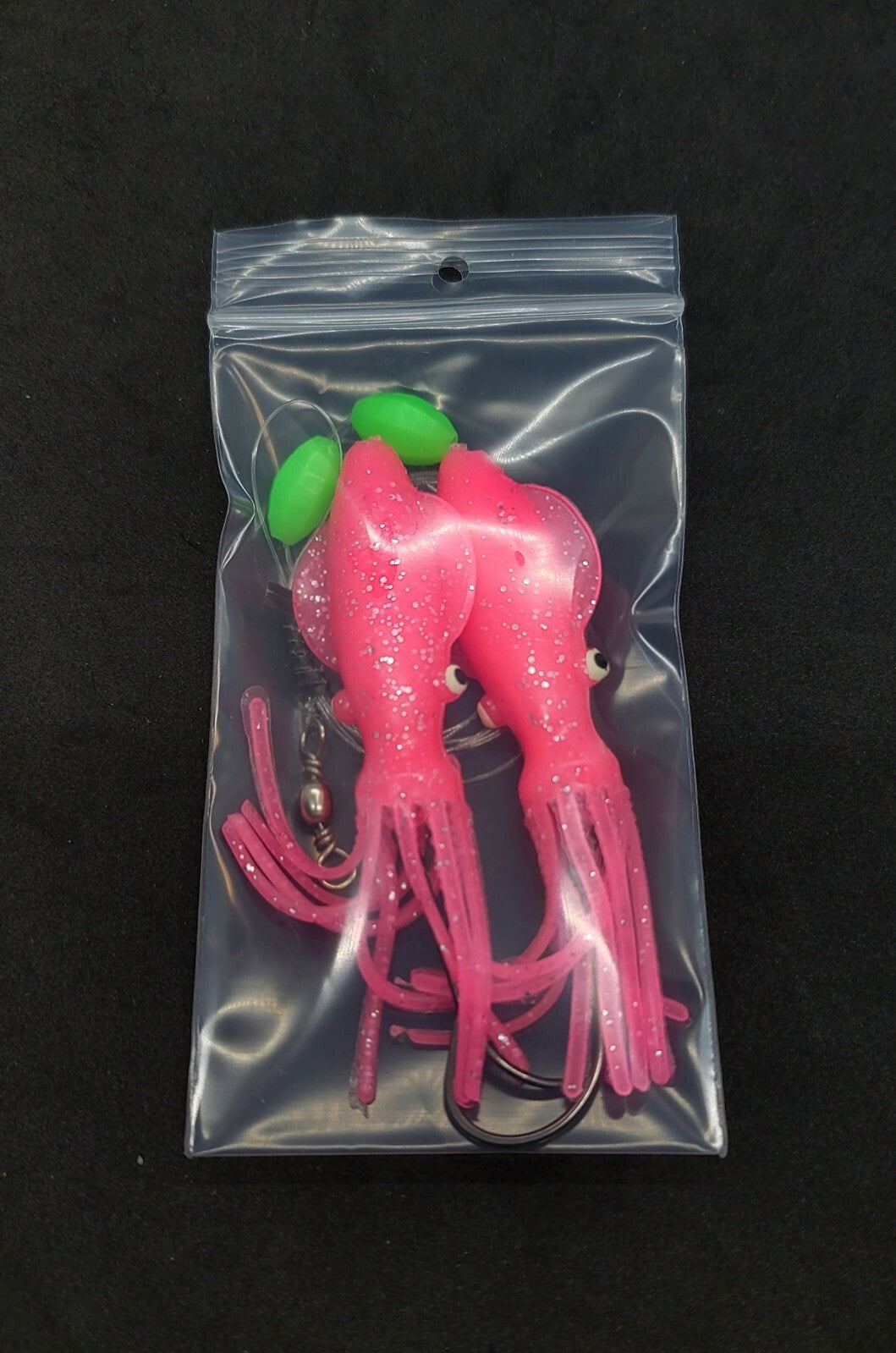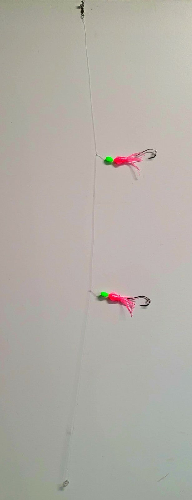 This is a Hi-Lo with 2 Pink Glow Squids 4 inches in length on 2 , 4in dropper loops.